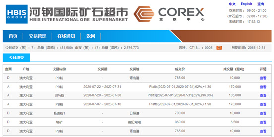 622日,由北鐵中心與河鋼共同打造的礦石超市業務板塊上線運行,當日申報47筆共計257.67萬噸,其中成交7筆共計48.15萬噸。