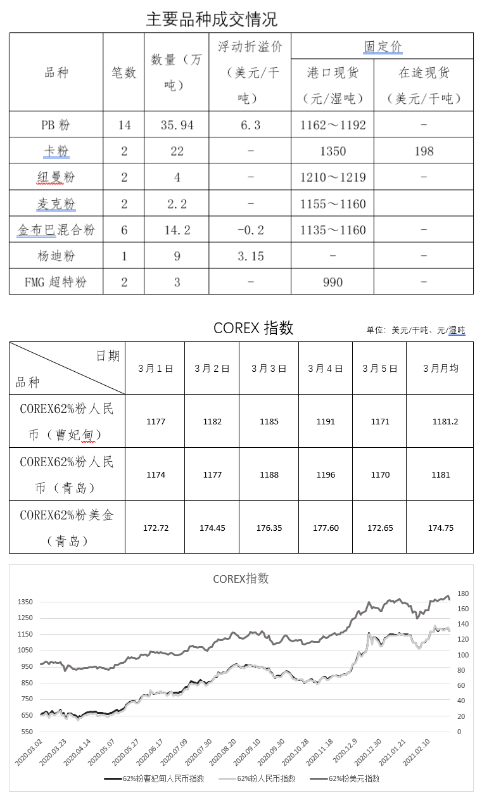 3月1日-3月5日成交47筆共126.14萬噸,其中在途6筆64.4萬噸,港口41筆61.74萬噸。