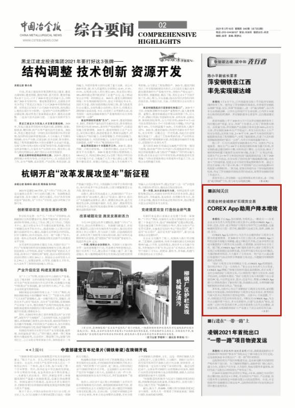 編者按:3月18日,《中國冶金報(bào)》二版以《實(shí)現(xiàn)全時全域鐵礦石現(xiàn)貨交易COREX App助用戶降本增效》為題,對用戶通過我公司COREX App達(dá)成便捷、高效交易,實(shí)現(xiàn)降本增效進(jìn)行了重點(diǎn)報(bào)道。