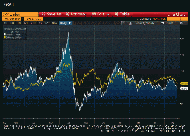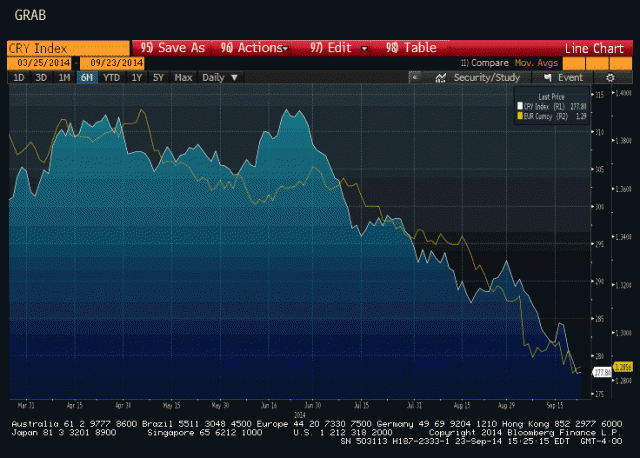 歐元對美元自6月以來下跌已經(jīng)超過800點,歐洲央行的降息和負利率政策被認為始作俑者。與此同時,大宗商品也是一路向南跌跌不休,兩者在過去6個月保持了驚人的同步性!