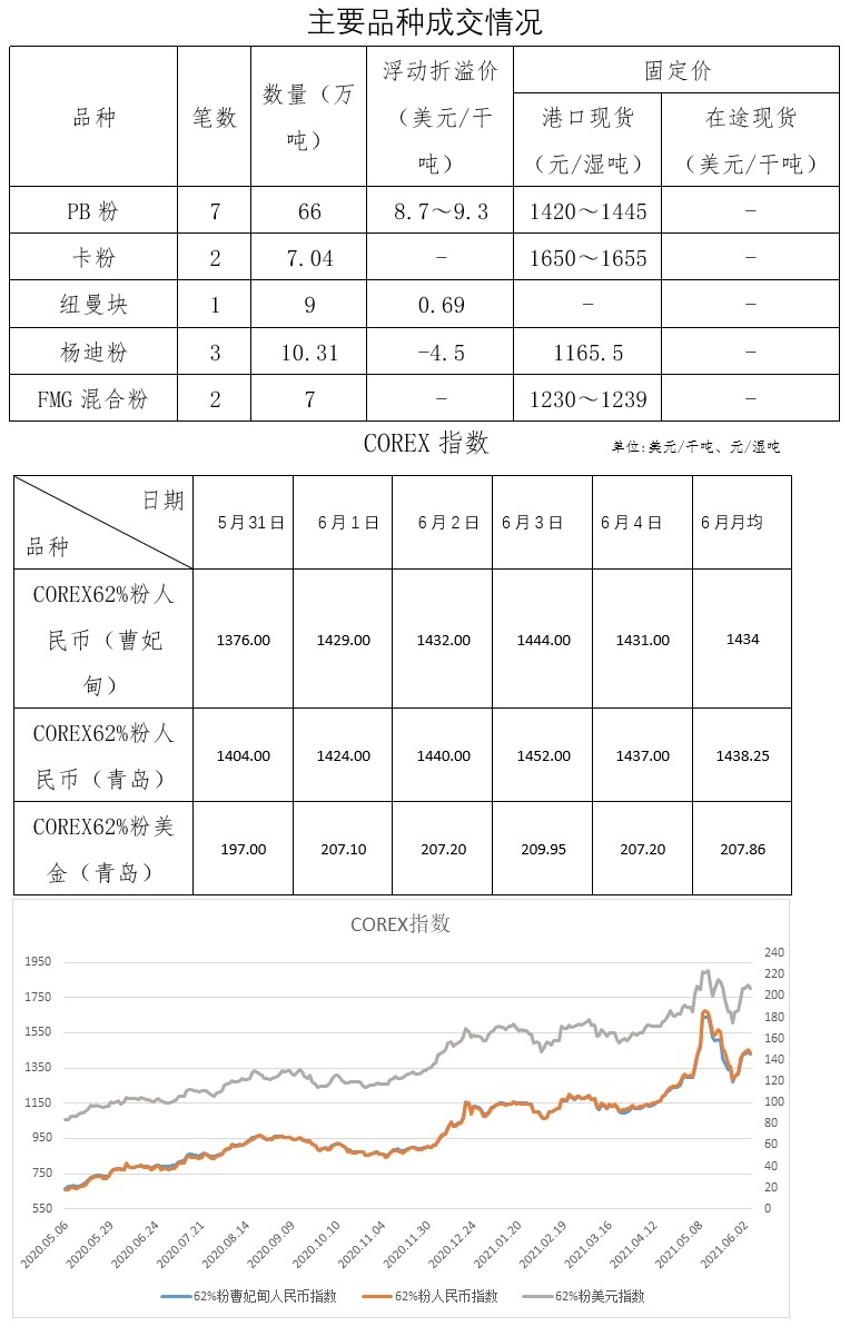 5月31日-6月4日成交21筆共108.85萬噸,其中在途5筆68萬噸,港口16筆40.85萬噸。