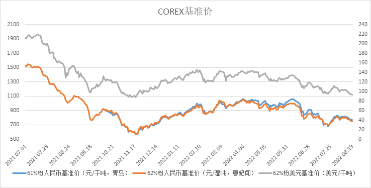COREX62%粉(美元/干噸,青島) | 98.10 | 97.80 | 94.10 | 93.85 | 92.60 | 100.7 |