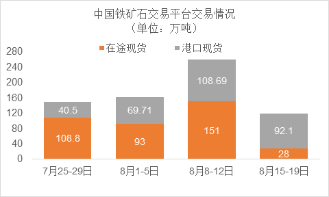8月15日-8月19日成交110筆共120.1萬噸,其中在途3筆共28萬噸,港口107筆共92.1萬噸。主要成交品種包括:PB粉34筆共34.55萬噸,麥克粉13筆共25.3萬噸,金布巴混合粉11筆17.23萬噸,BRBF5筆6.67萬噸,F(xiàn)MG混合粉11筆共11.2萬噸,F(xiàn)MG超特粉7筆5.43萬噸。