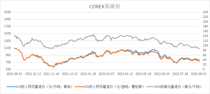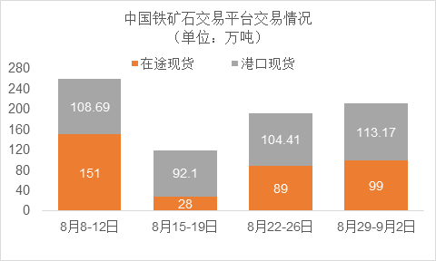 8月29日~9月2日成交94筆共212.17萬噸,其中在途9筆共99萬噸,港口85筆共113.17萬噸。主要成交品種包括:PB粉31筆共80.68萬噸,BRBF 1筆共17萬噸,卡拉加斯粉3筆共1.25萬噸,麥克粉15筆共20.18萬噸,金布巴混合粉7筆8.7萬噸,FMG混合粉8筆共8.2萬噸。