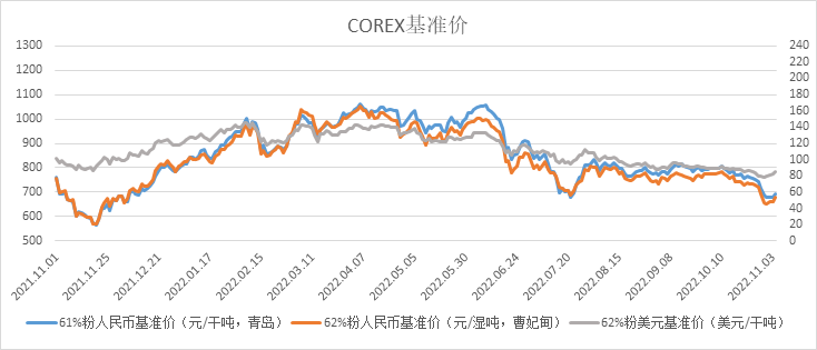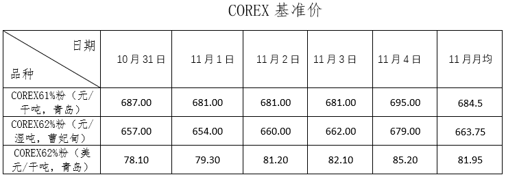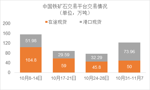 10月31日~11月4日成交83筆共123.96萬噸,其中在途4筆共50萬噸,港口79筆共73.96萬噸。主要成交品種包括:金布巴混合粉11筆共10.67萬噸,PB粉18筆共51.7萬噸,紐曼塊2筆共16萬噸,FMG混合粉5筆共3.35萬噸,麥克粉3筆共3萬噸,FMG超特粉5筆共3.2萬噸,BRBF 3筆共3.2萬噸,卡拉加斯粉3筆共1.7萬噸。