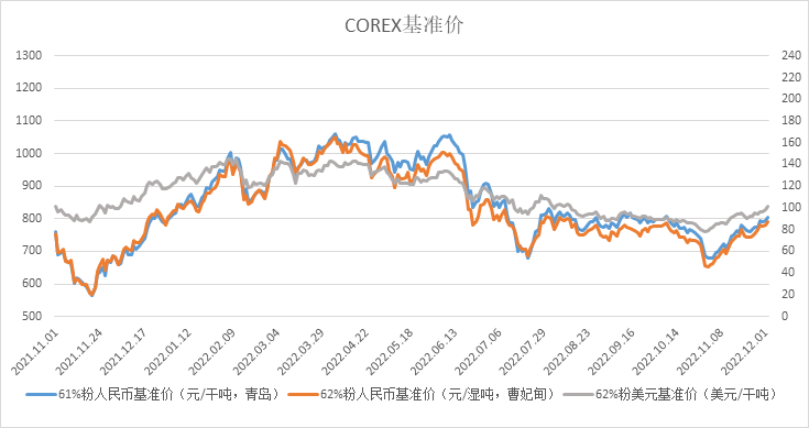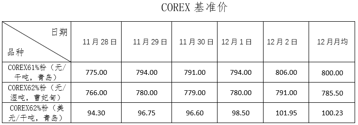 11月28日~12月2日成交53筆共99.93萬噸,其中在途7筆共58萬噸,港口46筆共41.93萬噸。主要成交品種包括:PB粉10筆共12.5萬噸,金布巴混合粉8筆共30萬噸,麥克粉7筆共21.5萬噸,卡粉4筆共4.51萬噸, FMG混合粉7筆共5.37萬噸,F(xiàn)MG超特粉2筆共1.7萬噸。
