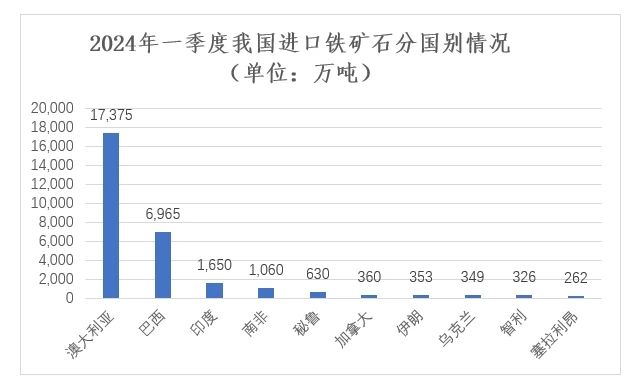 2024年一季度我國共進口鐵礦石為31017萬噸,同比增長5.6%;進口額為401.4億美元,同比增長16.7%;進口均價為130美元/噸,同比上漲10.6%。