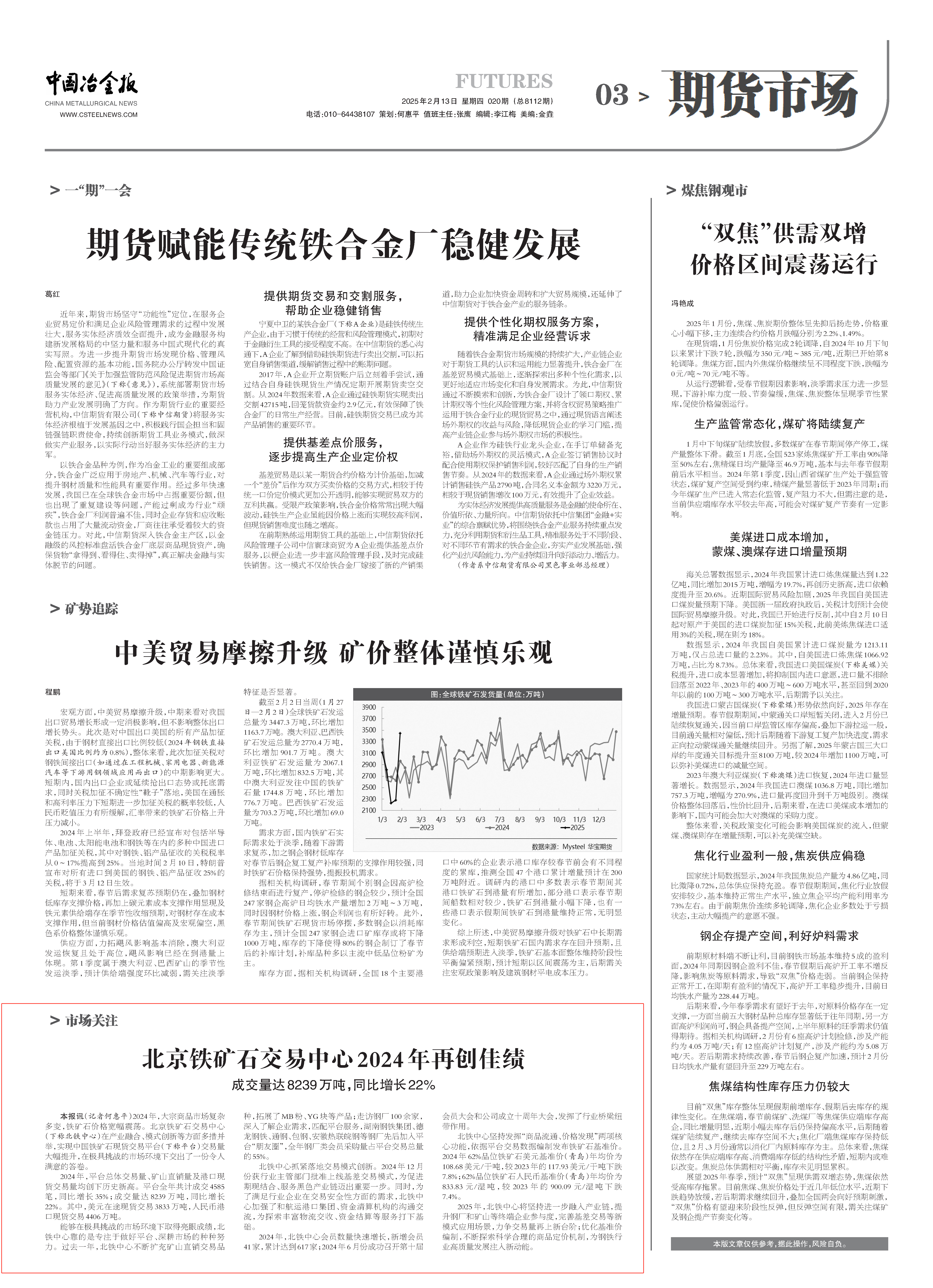 2025年,北鐵中心將堅持進一步融入產業鏈,提升鋼廠和礦山等終端企業參與度,完善基差交易等新模式應用場景,力爭交易量再上新臺階;優化基準價編制,不斷探索科學合理的商品定價機制,為鋼鐵行業高質量發展注入新動能。